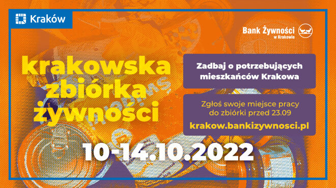 Od dziś (12 września) do piątku 23 września trwa nabór do tegorocznej edycji Krakowskiej Zbiórki Żywności. Akcja adresowana jest do firm, urzędów, uczelni, szkół i innych instytucji działających na terenie Krakowa. Celem zbiórki jest wparcie mieszkańców stolicy małopolski, których nie stać na samodzielny zakup żywności i potrzebują wsparcia. Zbiórka potrwa od 10 do 14 października 2022.