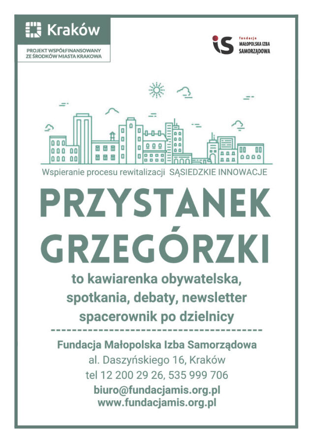 Projekt PRZYSTANEK GRZEGÓRZKI jest realizowany w ramach „Wspierania procesu rewitalizacji – SĄSIEDZKIE INNOWACJE – Przystanek Grzegórzki”. Przedsięwzięcie jest zadaniem publicznym, współfinansowanym ze środków Miasta Krakowa